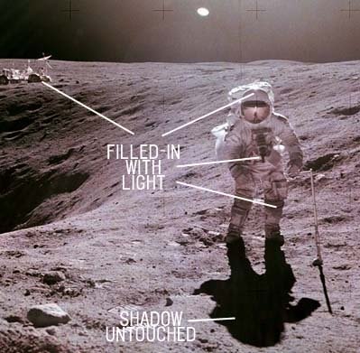Issue 2:The foreground of many images of the astronauts on the Moon are filled in with light, while the shadows remain absolutely black, again proving that there are multiple light sources.