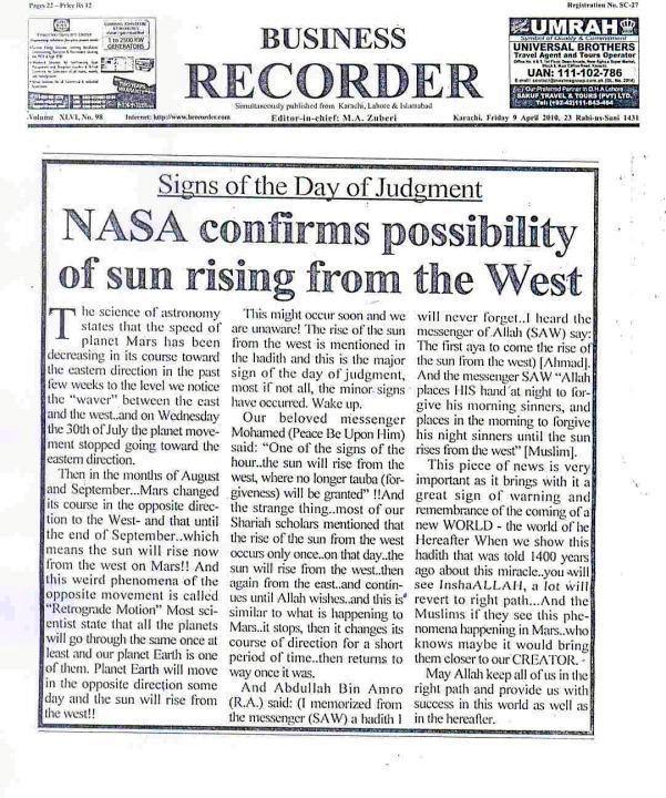 Adding weight to the claim by NASA is that this story has actually been published in newspapers under the title of “NASA confirms possibility of sun rising from the West”. Unfortunately this is probably just a case of the newspapers editor also being stupid enough to fall for it, but there may have been other reasons for its publication – such as to ridicule the writer, or to create disunity amongst Muslims. A copy of the publications and their transcriptions are below:
